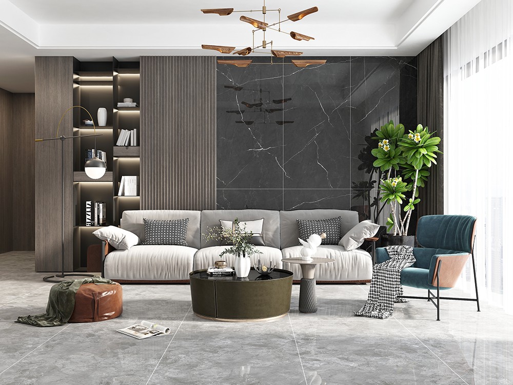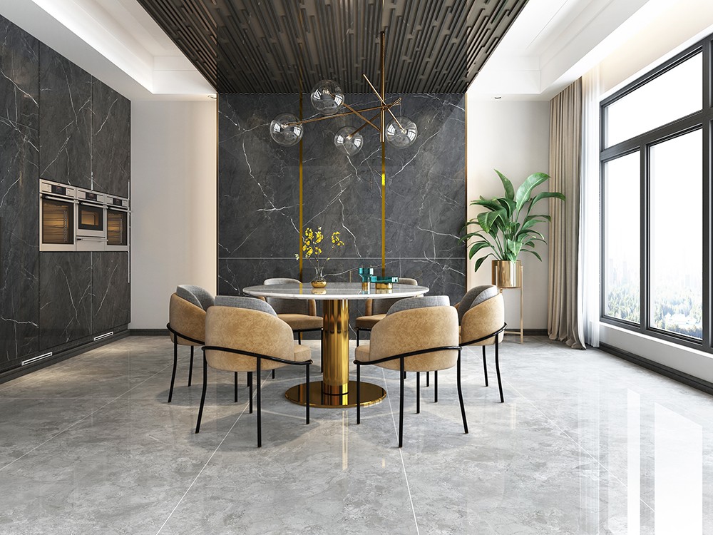 變幻莫測的白色紋理創造出層次,巖層底色般的深灰色調演繹出沉穩,以現代手法重新詮釋藝術之精華,寓意沉穩且富有內涵,鳳鳴朝陽,得天時地利人和。