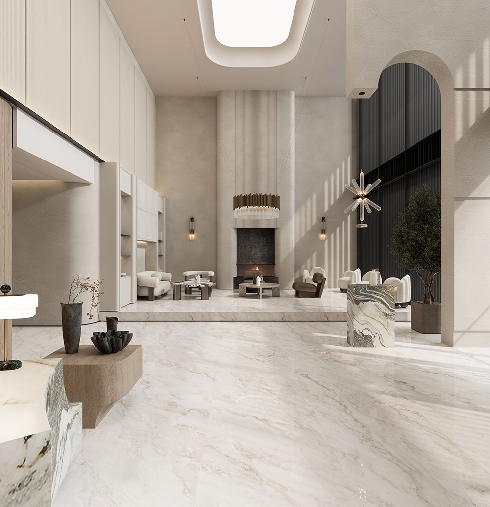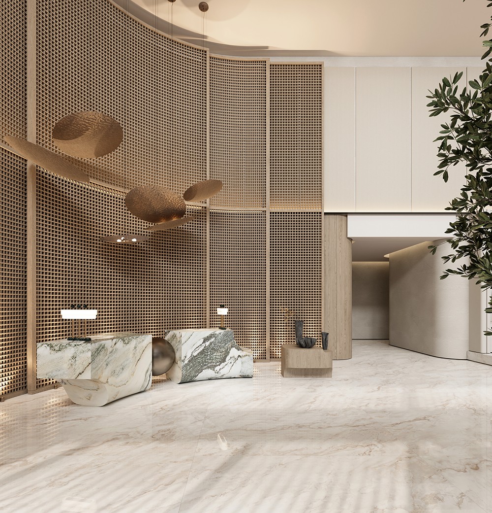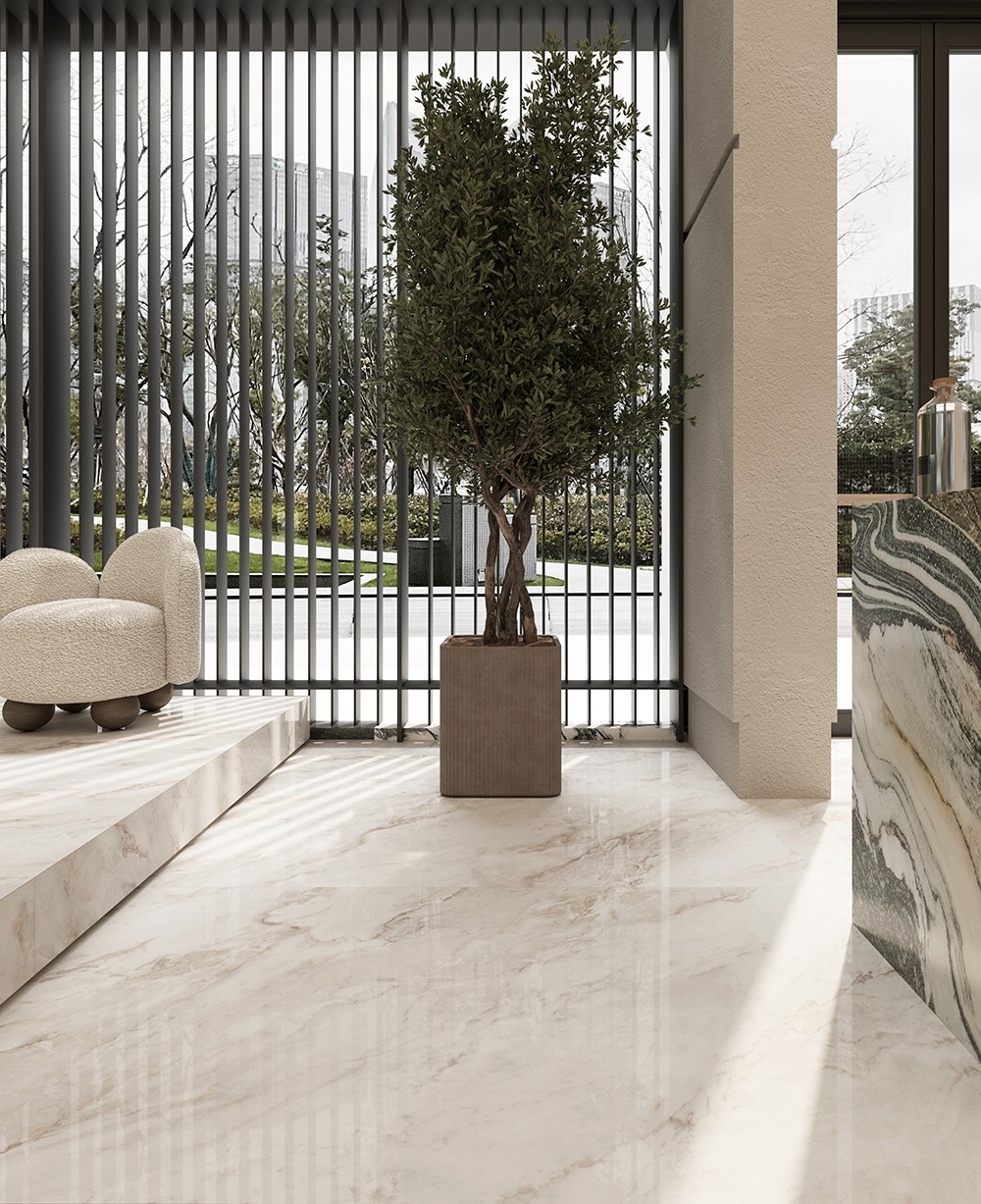 淺灰色為主色調,點綴著灰墨色與金棕色條紋與斑點,紋理線條流暢,仿佛是大自然中水流、山脈和光影的抽象化呈現。