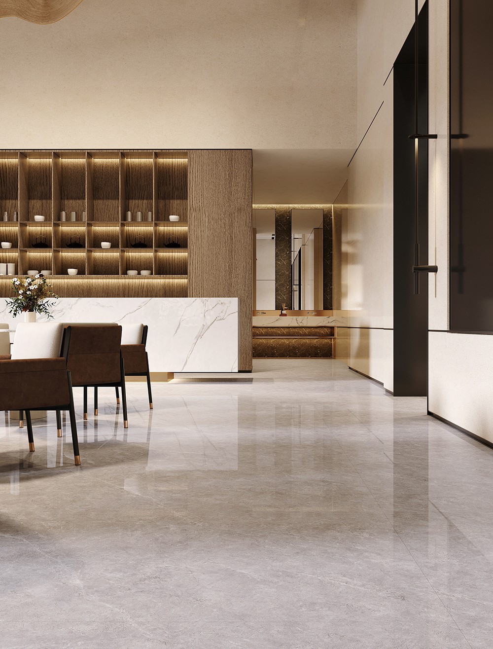 經典灰色理石紋產品,每一處都是大自然的縮影,不規則紋理交錯融合,遠看恢弘大氣,近看層次細膩。