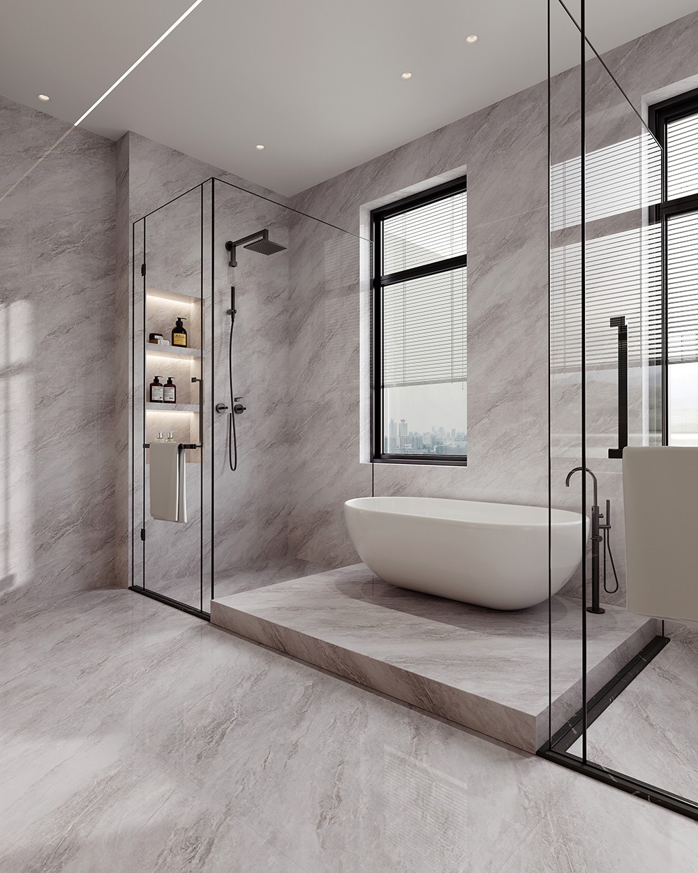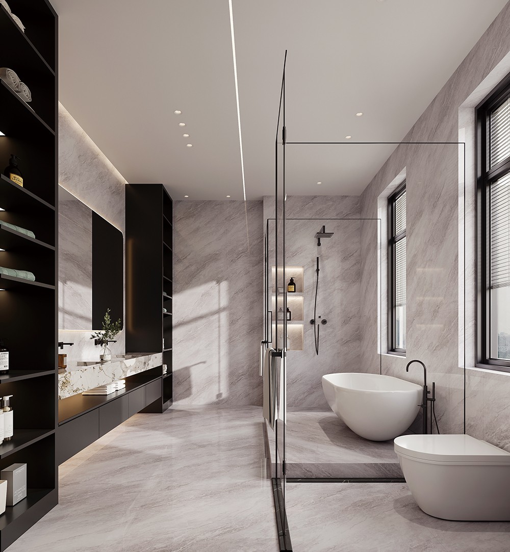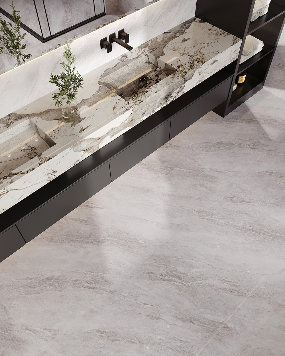 細膩的灰色線條在白色底色上蜿蜒流淌,如云霧山巒,又似輕柔絲帶,賦予空間流動的美感與自然氣息。
